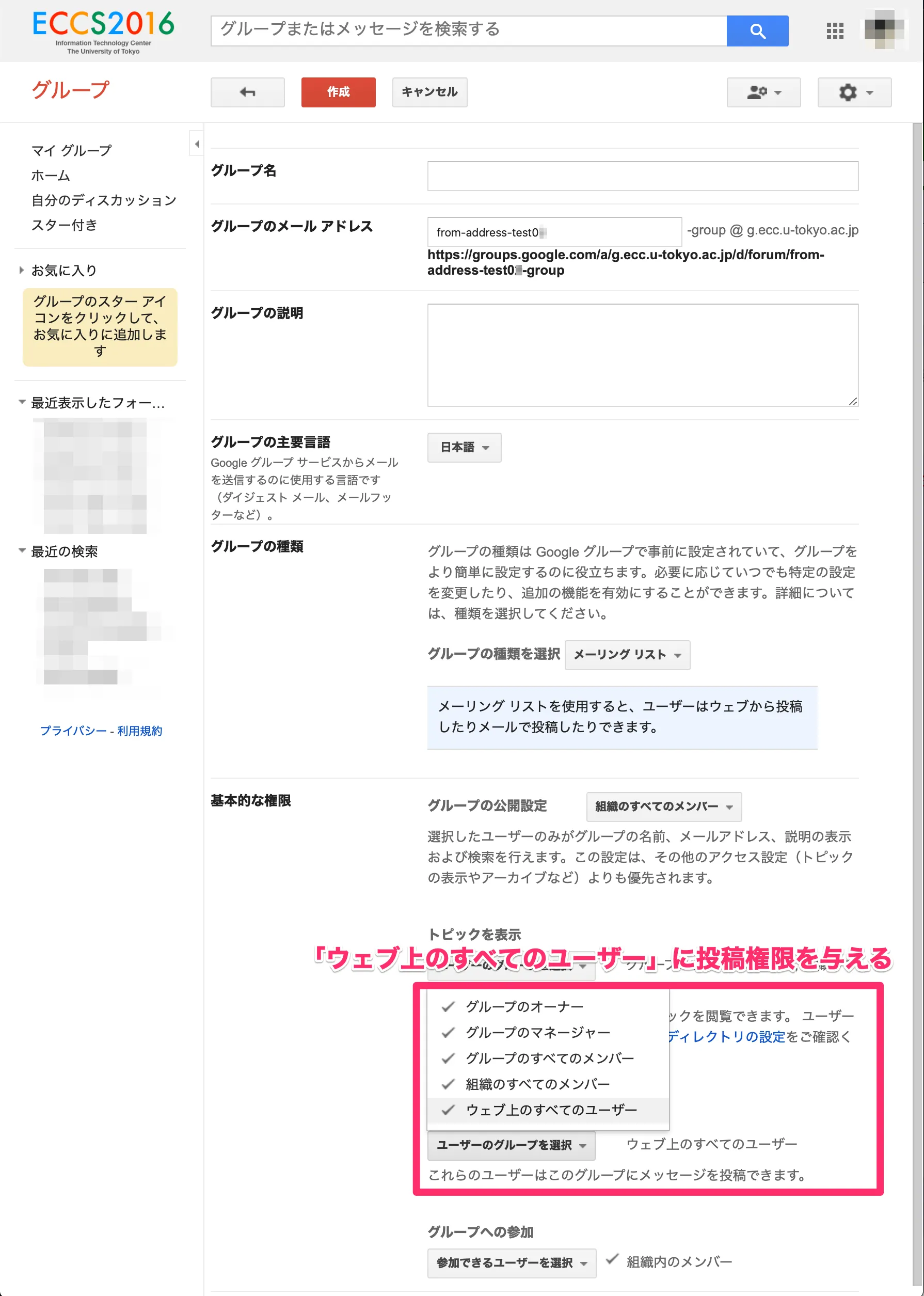 1. グループを作成してください.その際,いったん「ウェブ上のすべてのユーザー」に投稿権限を与えてください.