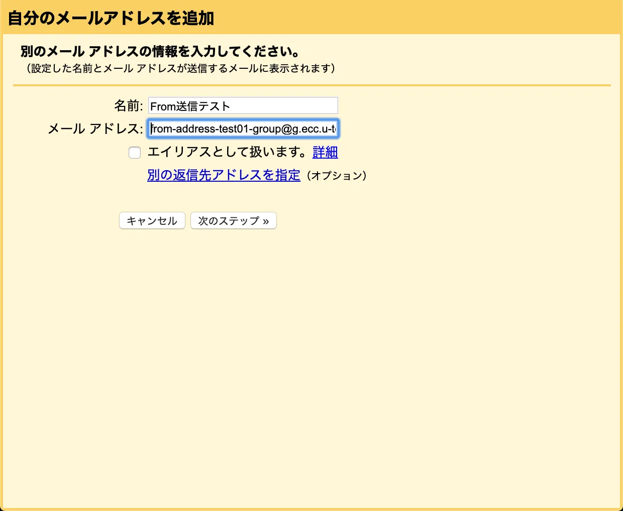 4. 「名前」に送信時に表示したい名前を,「メールアドレス」にメーリングリストのアドレスをそれぞれ入力して,次のステップに進んでください.
