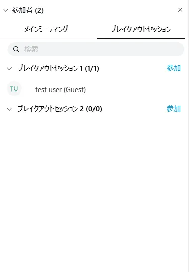 • 参加者の一覧がメインミーティングとブレイクアウトセッションに分かれます.ブレイクアウトセッションには各セッションごとに参加者が一覧表示されます.