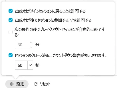 • 「設定」をクリックすると,参加者のブレイクアウトへの途中参加や途中退出(メインミーティングへの移動)を許可するか,セッションの制限時間,時間切れまでのカウントダウンタイマーの設定をすることができます.