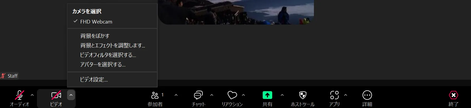 左下にある「ビデオ」と書かれたアイコンを押すことによってビデオのオン・オフを切り替えることができます.ビデオが停止されているときは,ビデオのアイコンに赤線のスラッシュが引かれます.