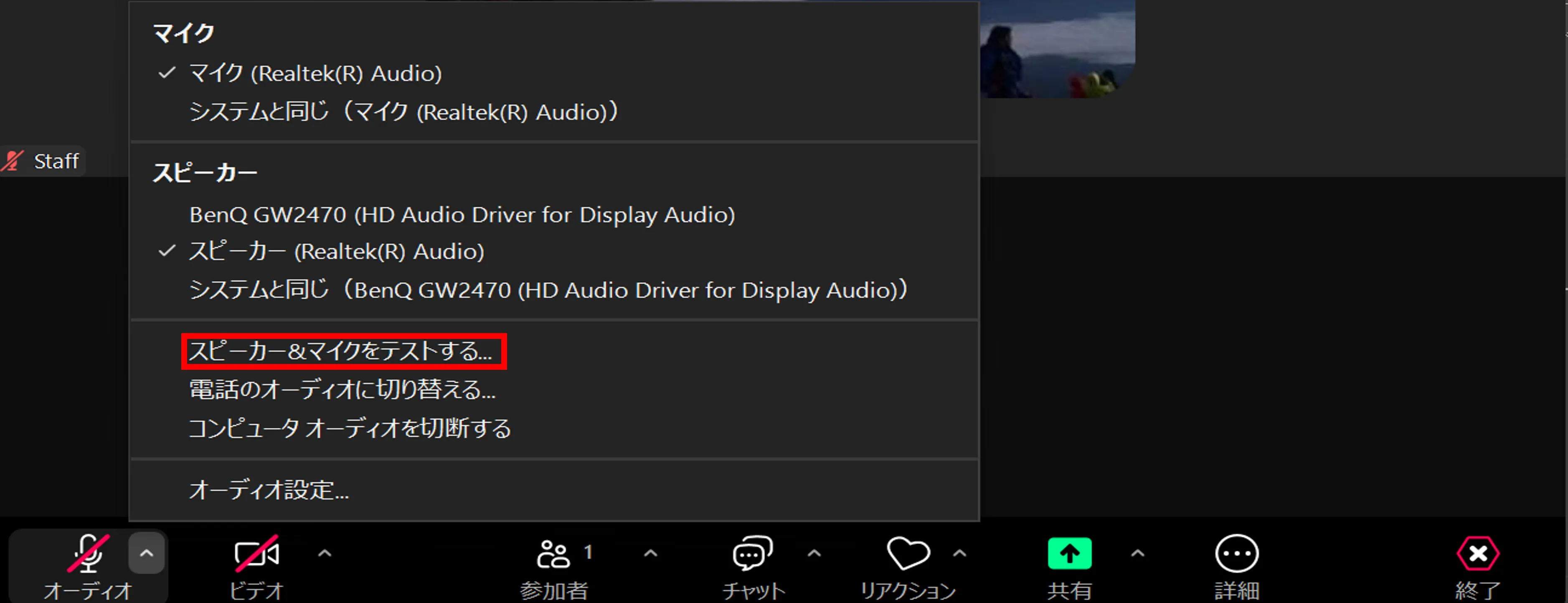 マイクのアイコンの右側の上向き矢印を押すと,追加のメニューが表示されます.「スピーカー & マイクをテストする」というボタンを押すことでテスト機能の画面を開けます.